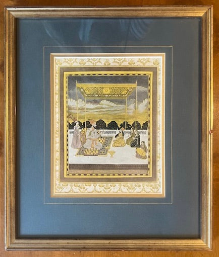 Vintage framed Indian wedding scene, framed beautifully with simple gold frame, decorative inner mat and dark green / grey mat board. Behind glass. Ready to hang. Portrait. See matching piece, listed separately.