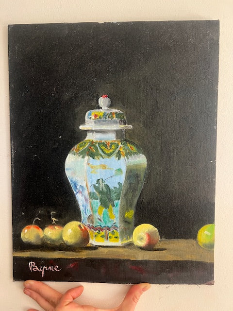 Original oil painting of decorative ceramic and apples. Gorgeous vintage tones. Signed Byrne. Not framed. oil painting on board.